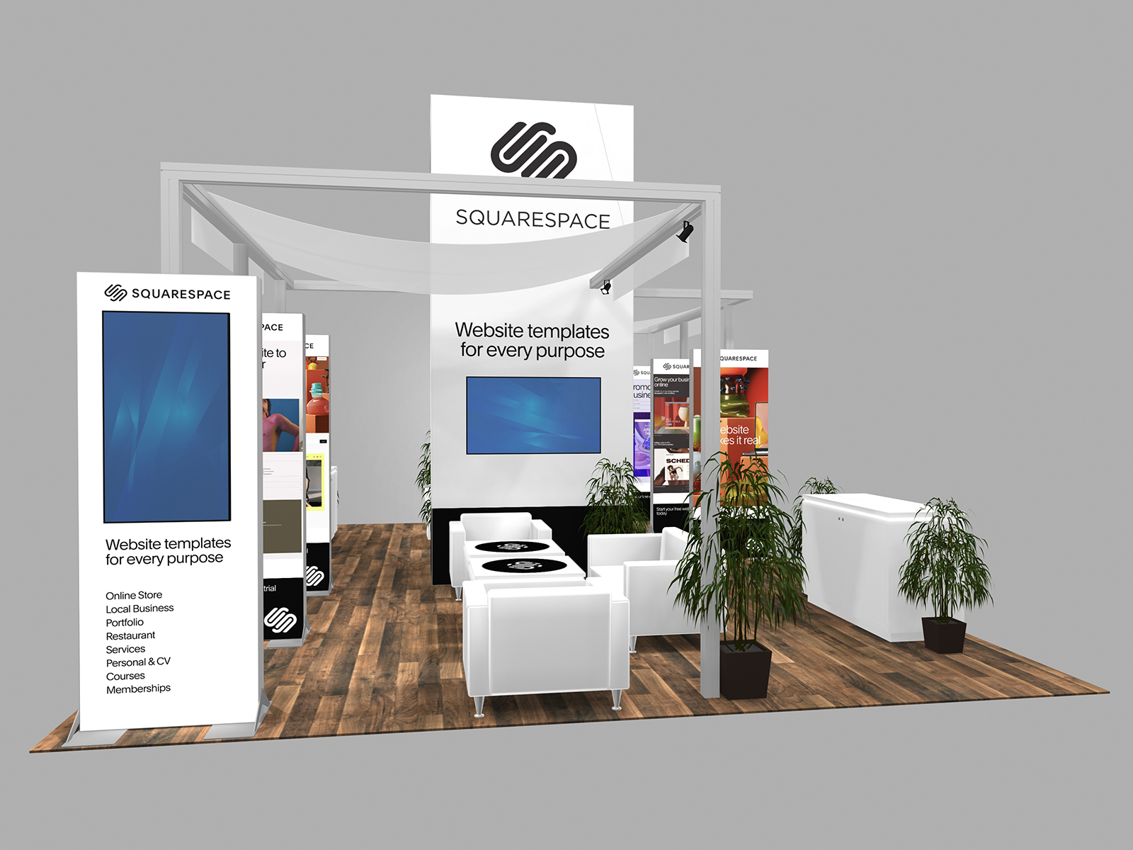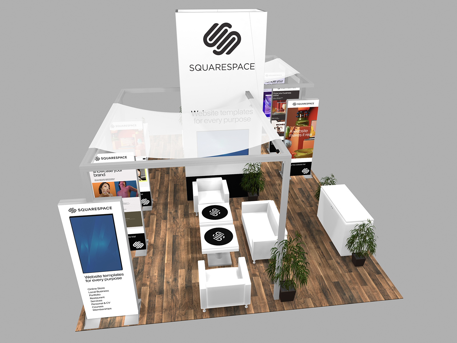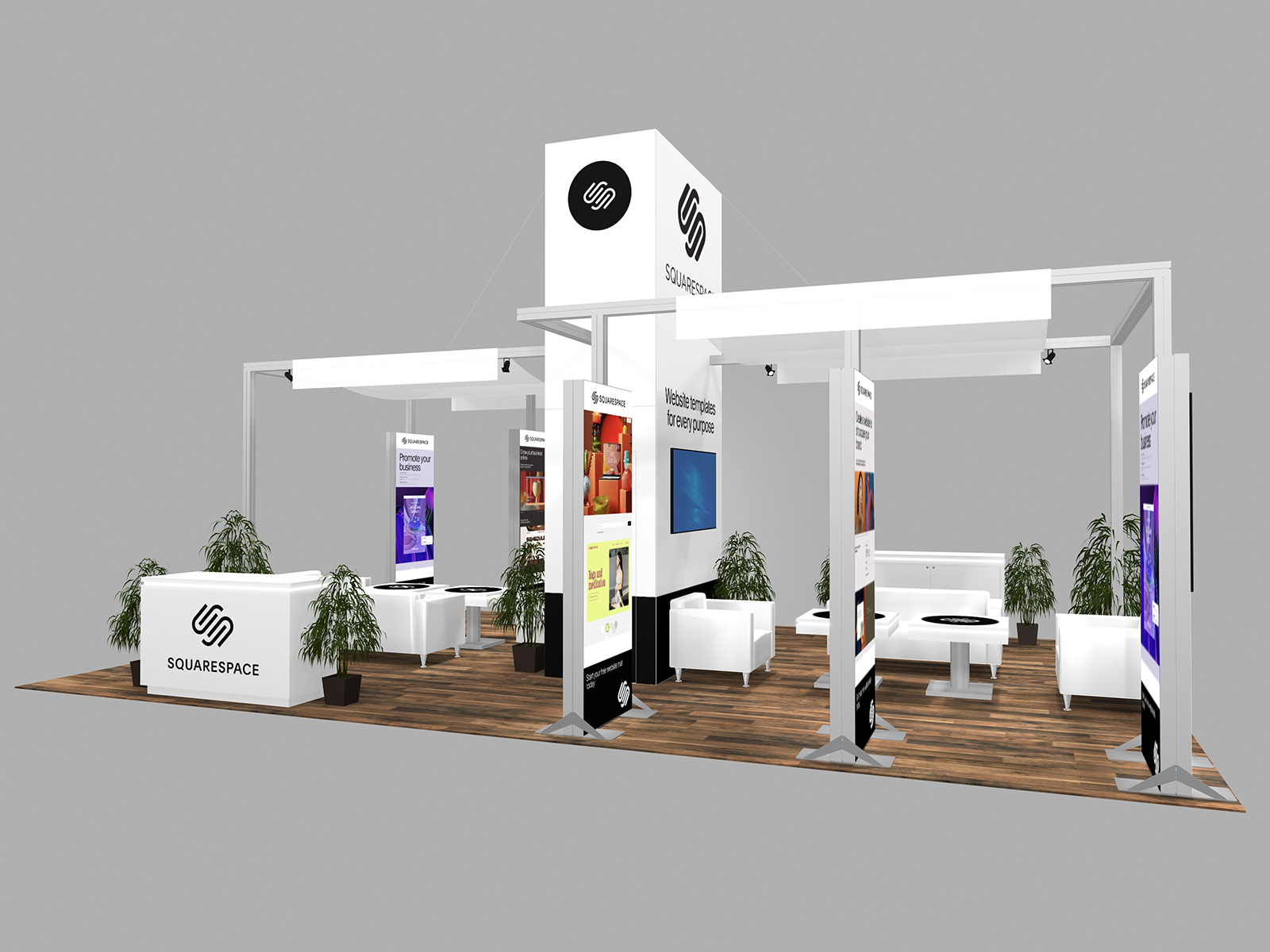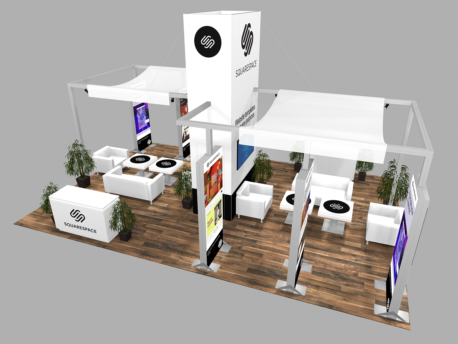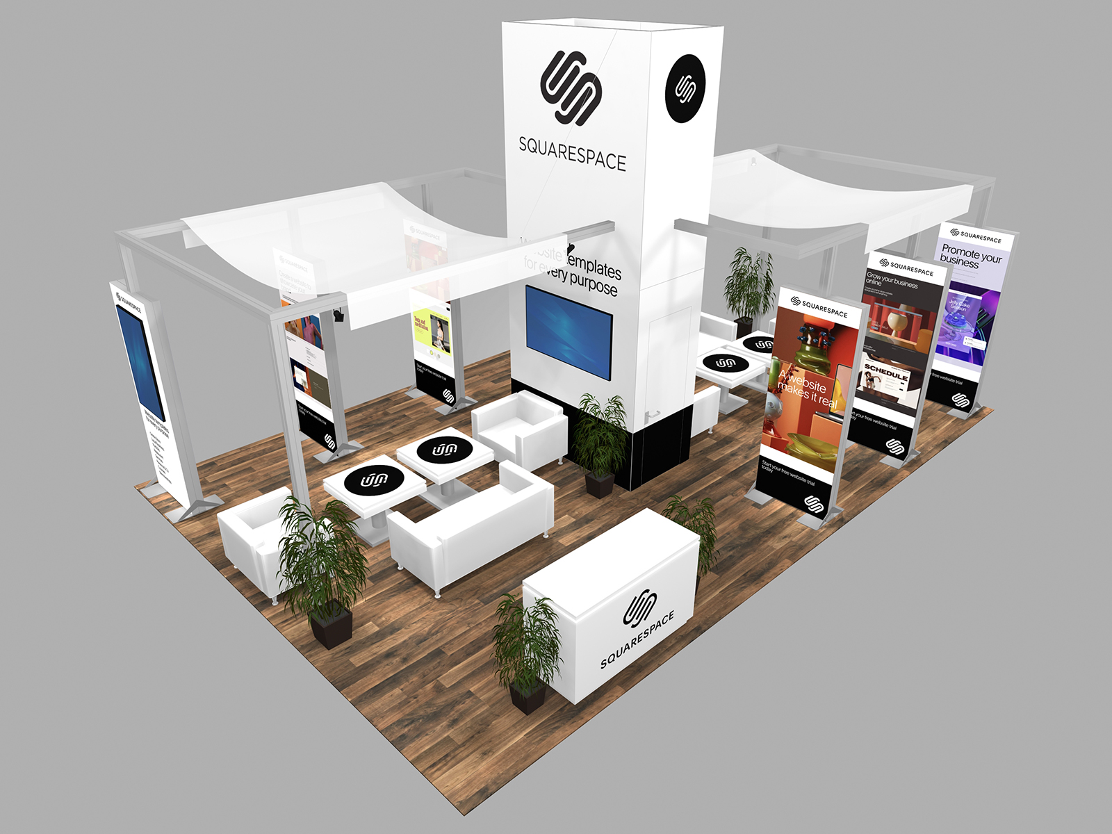 All three incorporate soft seating areas and charging tables for relaxed meetings. The towers serve multiple purposes. The height offers elevated brand visibility on the show floor and provides additional storage in the booth for promotional products, samples, literature, or personal items.