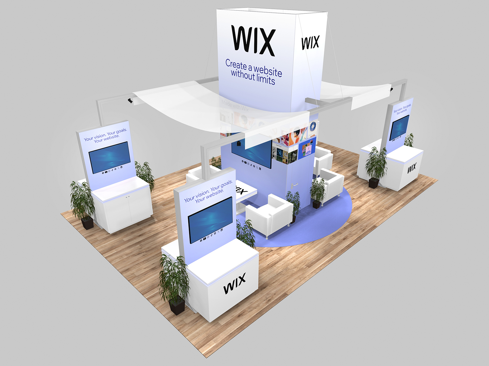 Comfortable and productive are rarely used together to describe a trade show exhibit design. Yet, the VK-5216, VK-5218 and VK-5218 series of 20 x 30 islands are perfect examples of how design can blend these two concepts into a stylish booth. They feature large format fabric graphics with backlighting, demo stations, and multiple monitors, The VK-5216 and VK-5217 have ceiling canopies with scrim fabric, whereas the VK-5218 has a rectangle hanging sign for increased visibility.